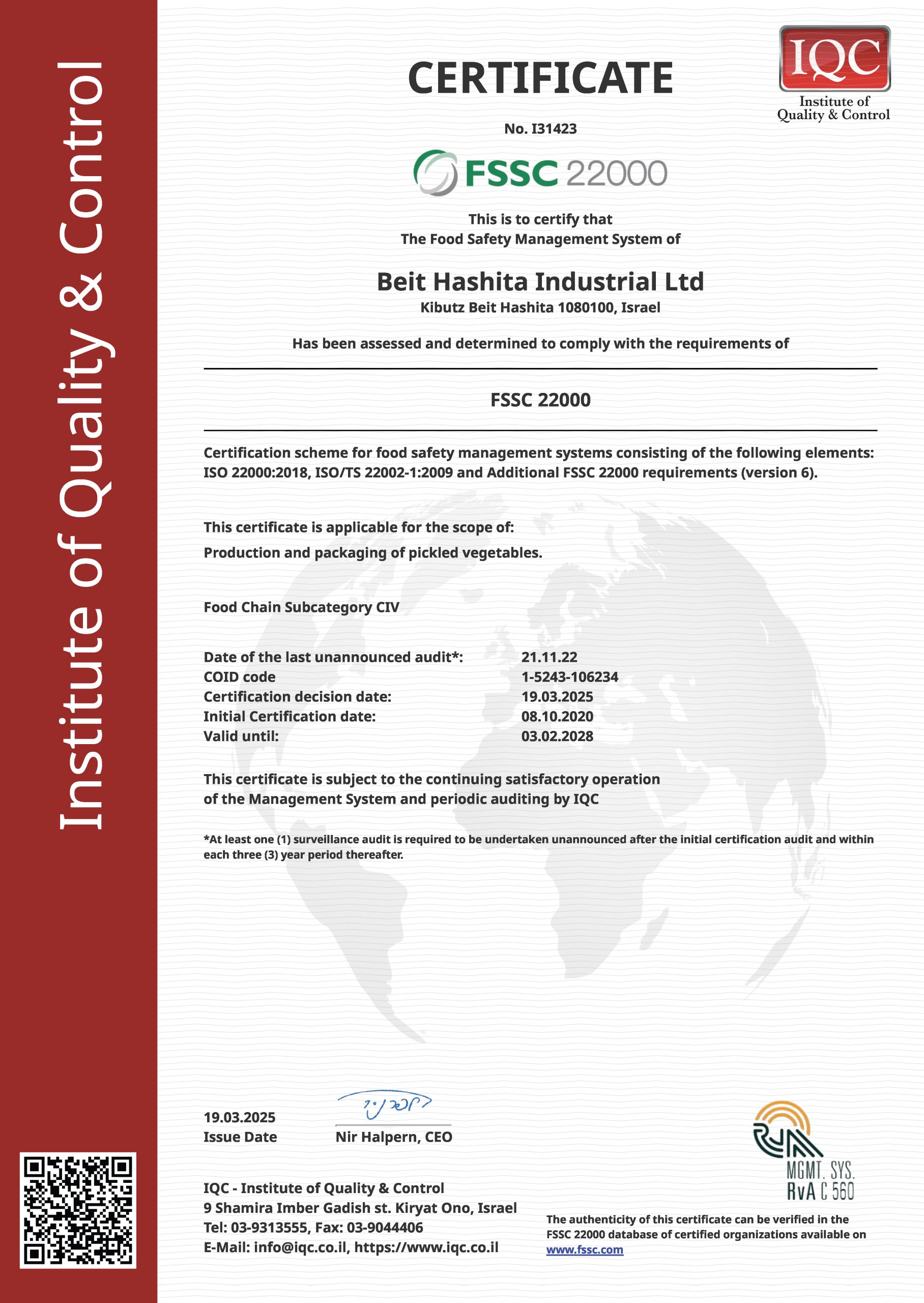 Beit Hashita invests a lot of resources to ensure the quality of all its products. Therefore, we maintain a strict quality assurance system in all production, packaging and transportation processes. The management team and employees are committed to the company’s quality policy and food safety requirements derived from the laws, regulations and orders and in particular business license, manufacturer’s license, new food law, requirements of the Ministry of Health and Environment and any legal requirement relevant to the company. We will continue to make every effort to meet the needs of demand in the highest quantity, time and quality.